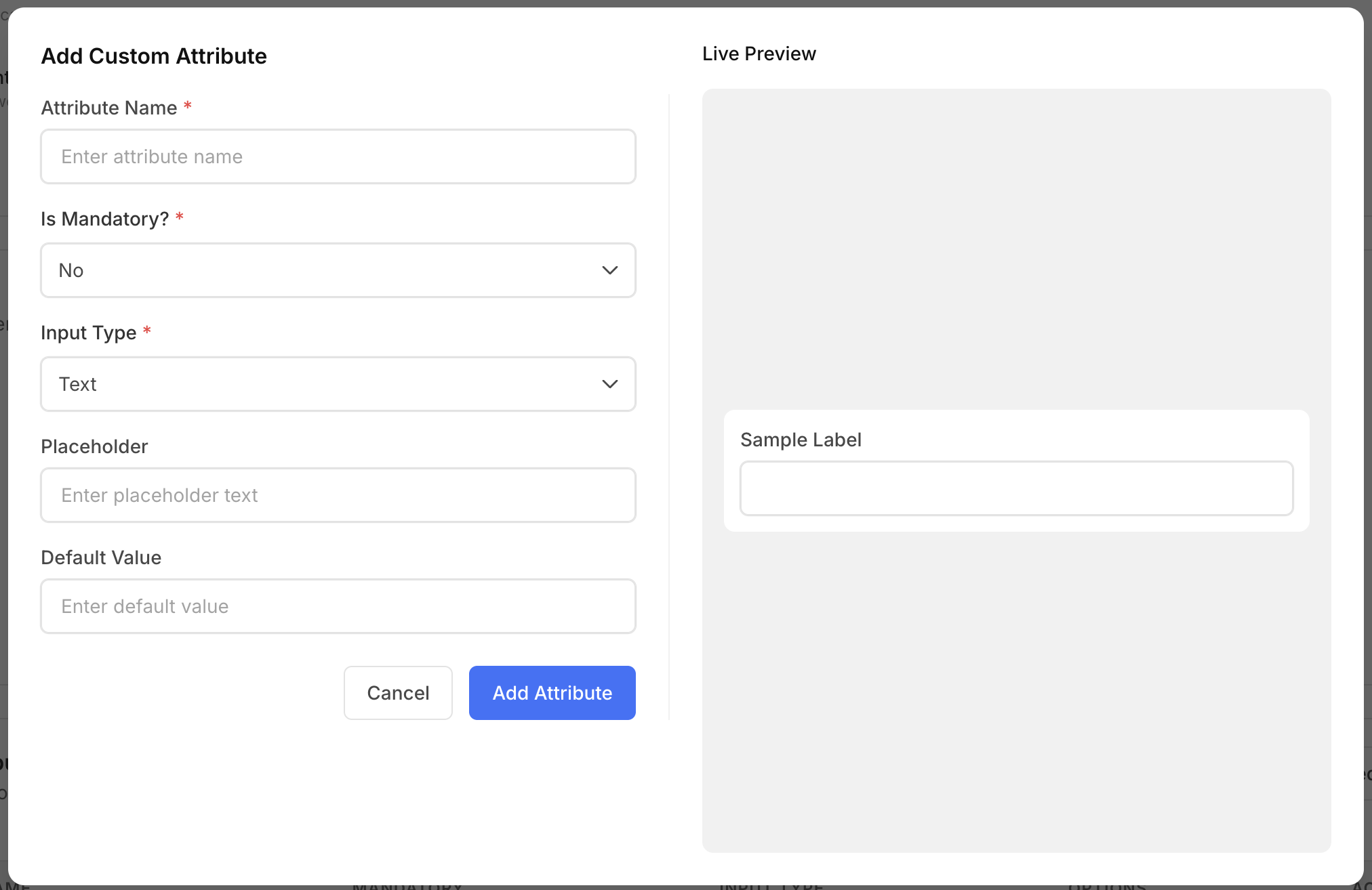 • Specify the attribute name. • Set the attribute as mandatory or optional. • Choose the input type — Text, Tags, Single Select, Multi Select, or Checkbox. • Define a placeholder value to guide input. • Select a default value, if required.