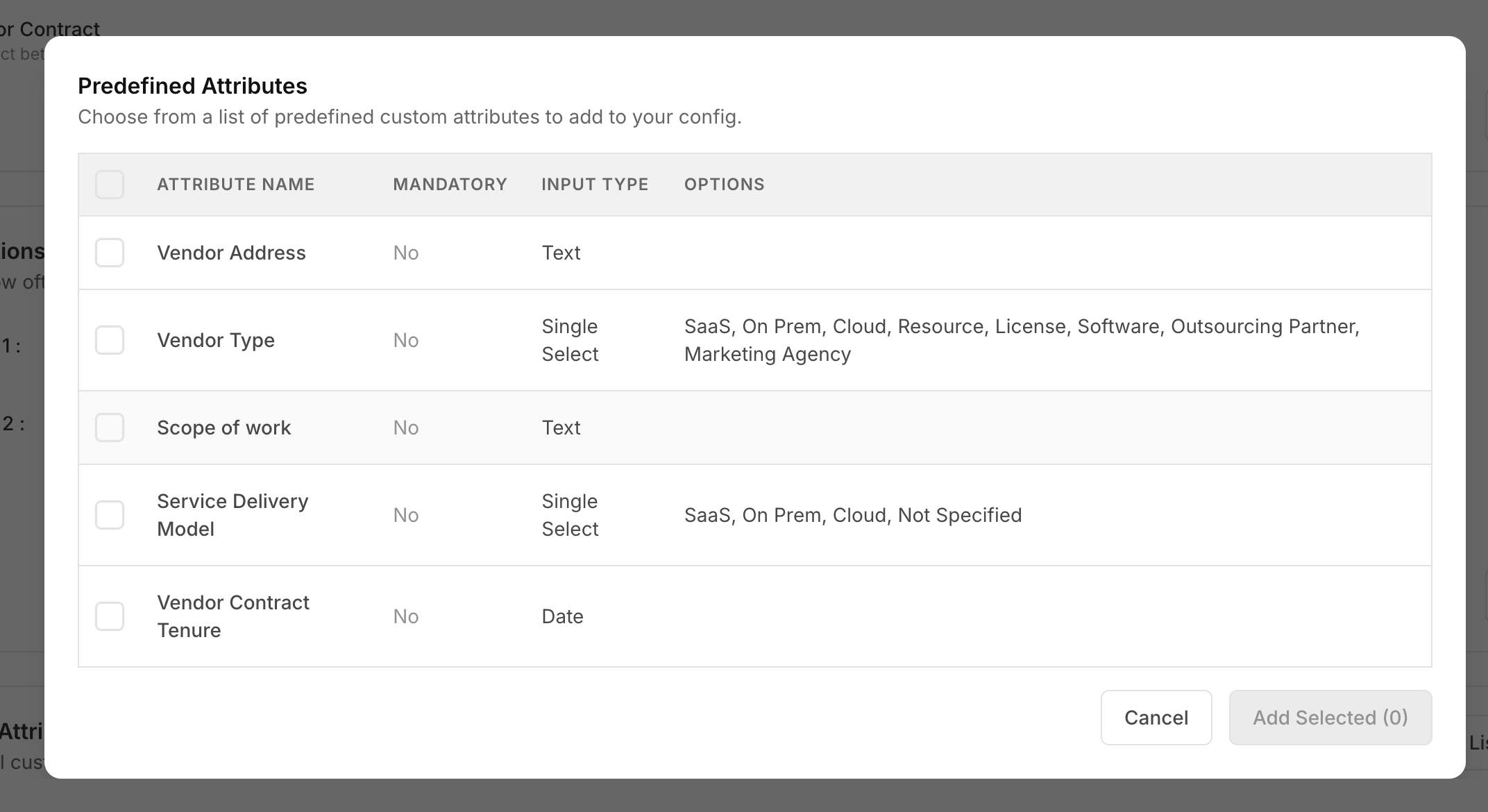 Once configured, these attributes can be used as questions or checklist items during vendor onboarding, offering a customizable and dynamic experience aligned with the organization’s data collection needs.