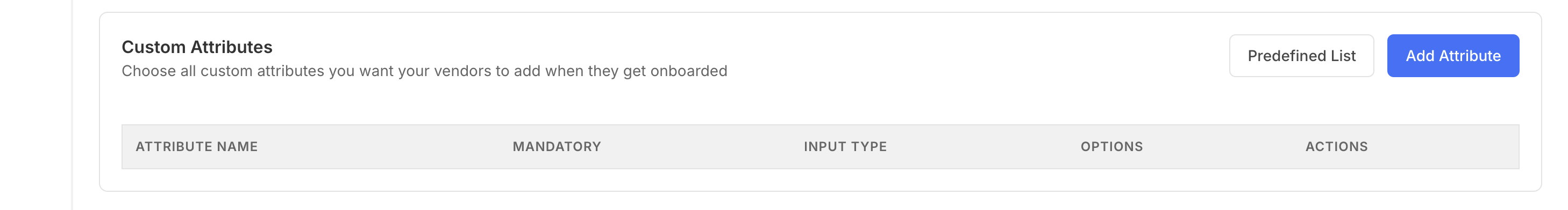 The Custom Attributes section allows users to define and configure additional questions or data points relevant to their vendor onboarding process. As shown in the example below, this feature provides complete flexibility to tailor the onboarding form to specific business requirements.
