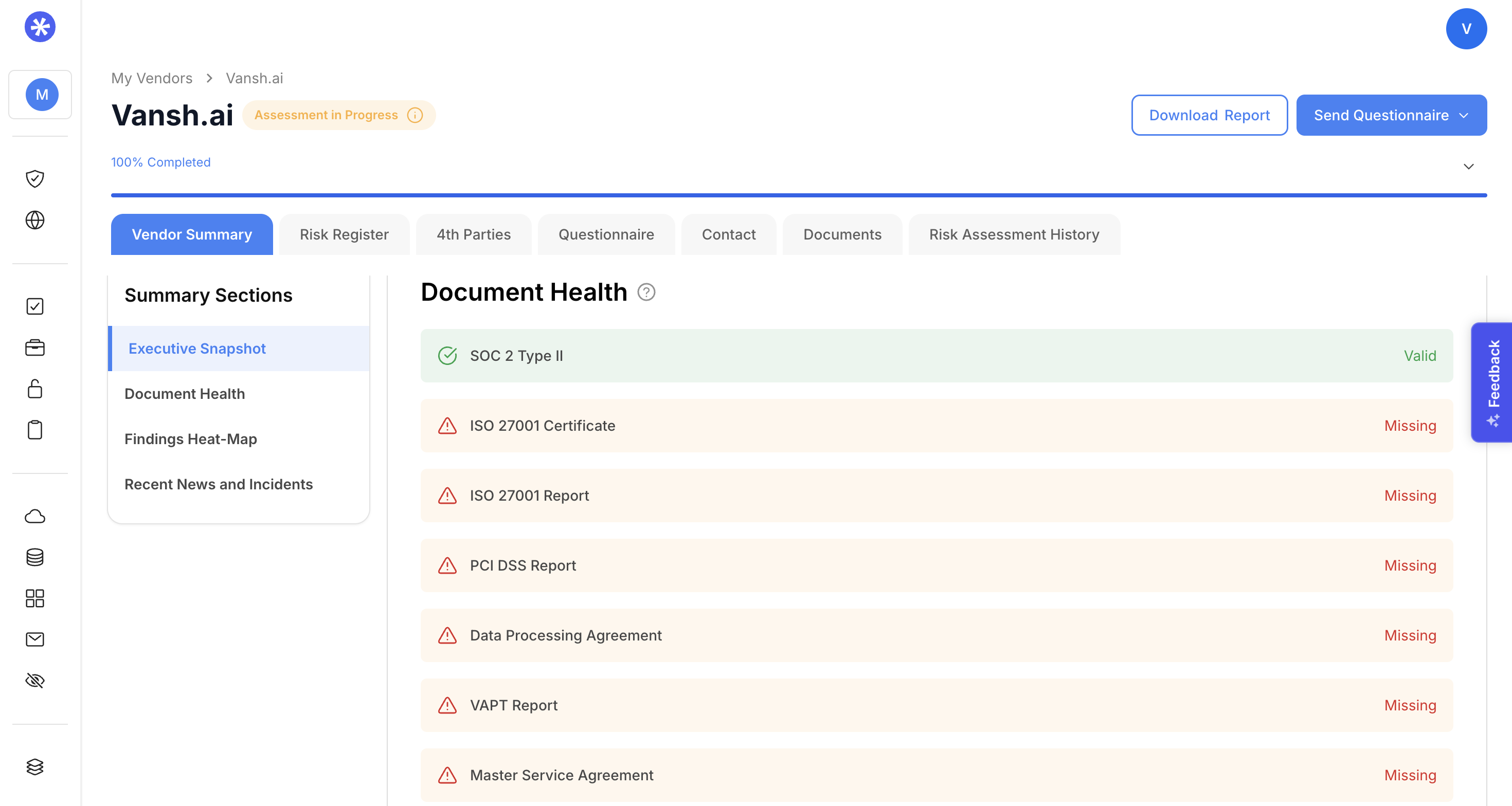 The Document Health section provides a centralised view of all critical compliance and security documents requested during vendor onboarding. Vendors can upload files such as SOC 2, ISO 27001, PCI DSS, DPA, VAPT, and MSAs to support risk assessments. Each document’s status is clearly displayed—Valid, Expired, or Missing—ensuring transparency. Missing documents highlight potential gaps, while valid ones strengthen the vendor’s security posture, helping organizations evaluate compliance readiness and associated risks effectively.