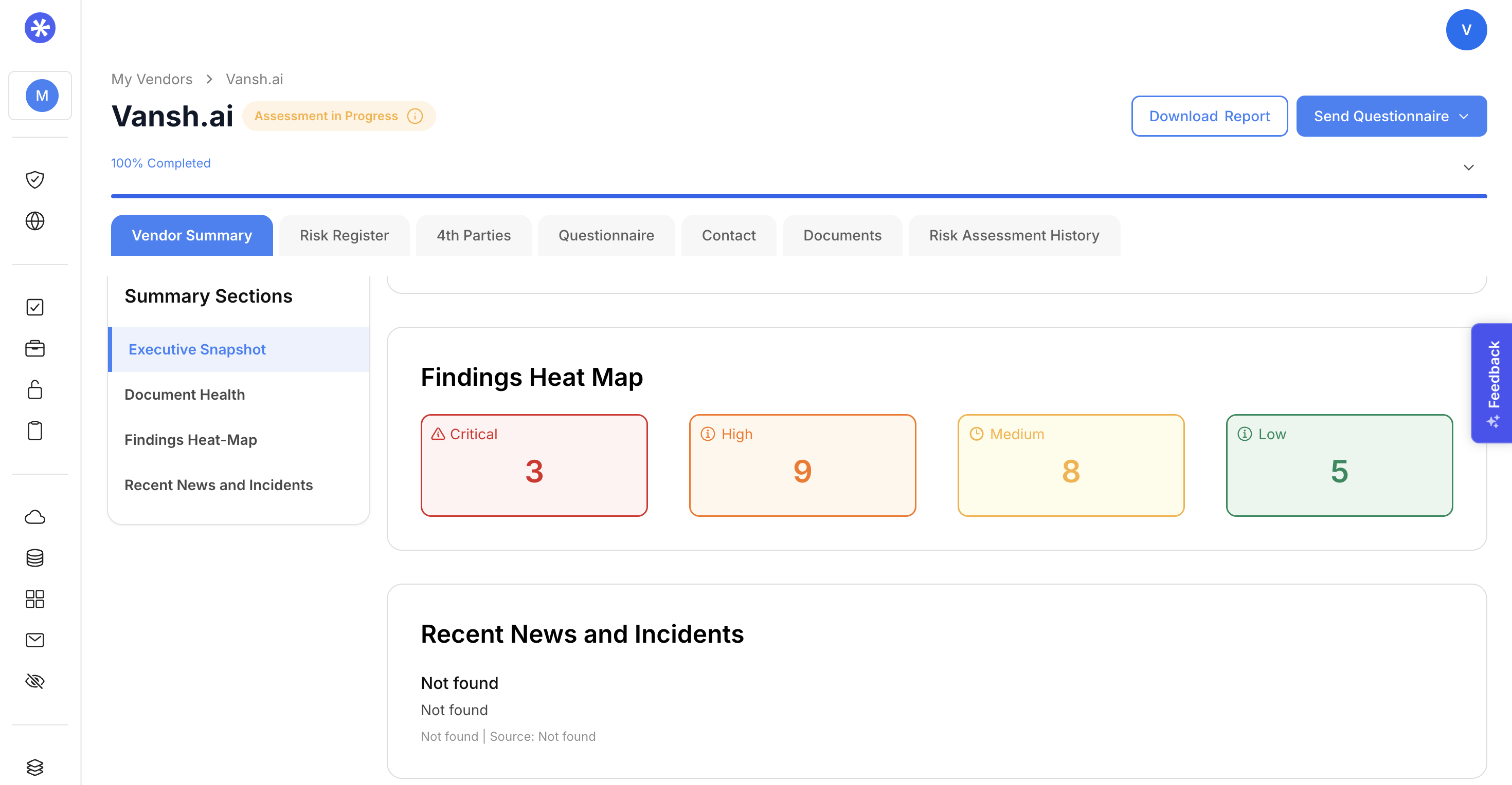 The Findings Heat Map provides a clear breakdown of identified risks by severity, categorized into Critical, High, Medium, and Low with corresponding numerical values. This visual summary allows stakeholders to quickly gauge the vendor’s overall risk exposure. Beneath it, the Recent News and Incidents section automatically aggregates and displays vendor-related news or incidents, ensuring real-time awareness of external developments that may affect vendor risk posture, compliance standing, or organizational reputation.