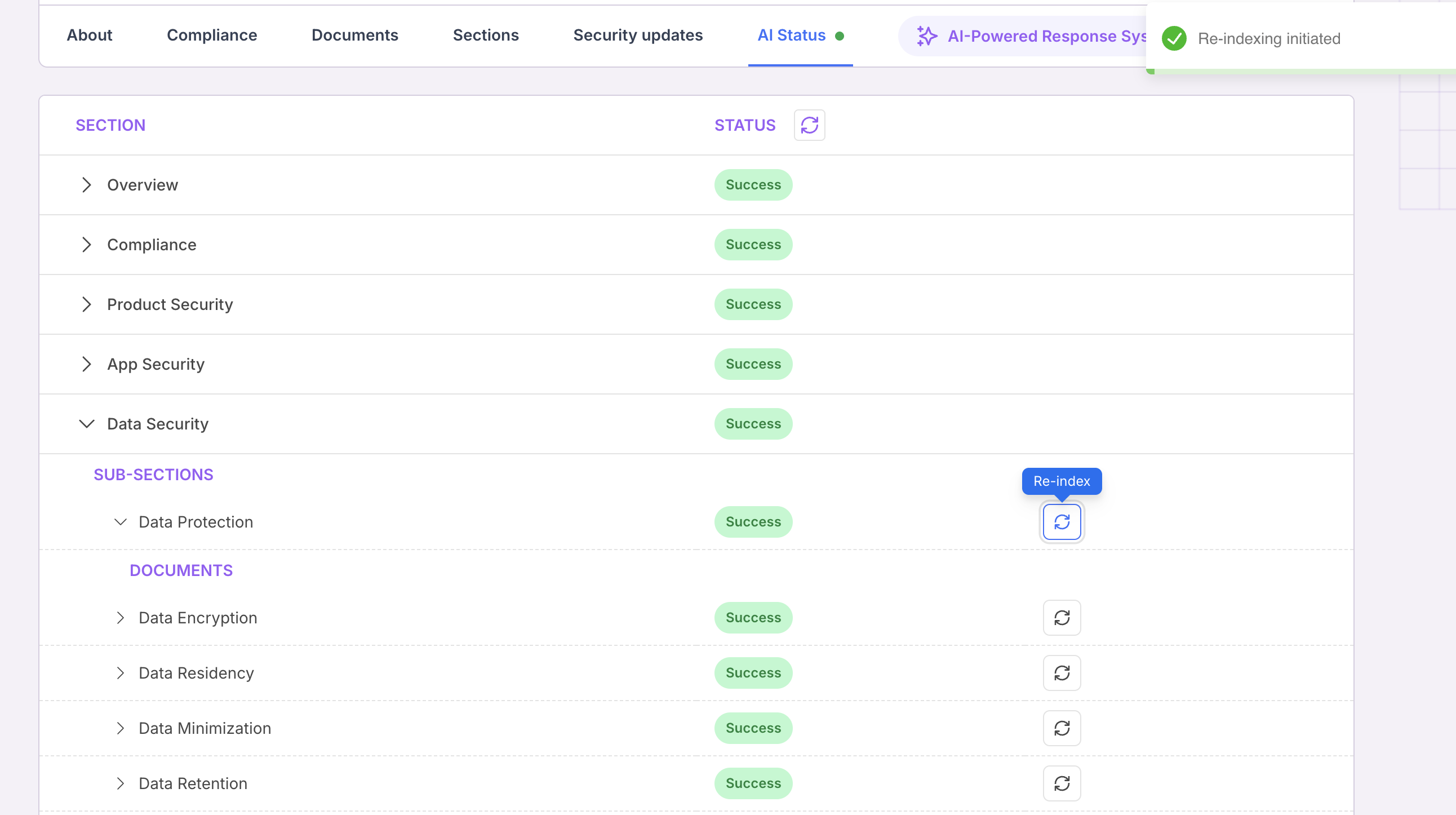 The AI Status section displays the Trust Center’s configured categories along with a Re-Index option. This allows users to re-trigger document processing, ensuring all content is refreshed and ready for parsing. Updated data then seamlessly supports the Ask a Question feature and the AI-powered questionnaire response flow.