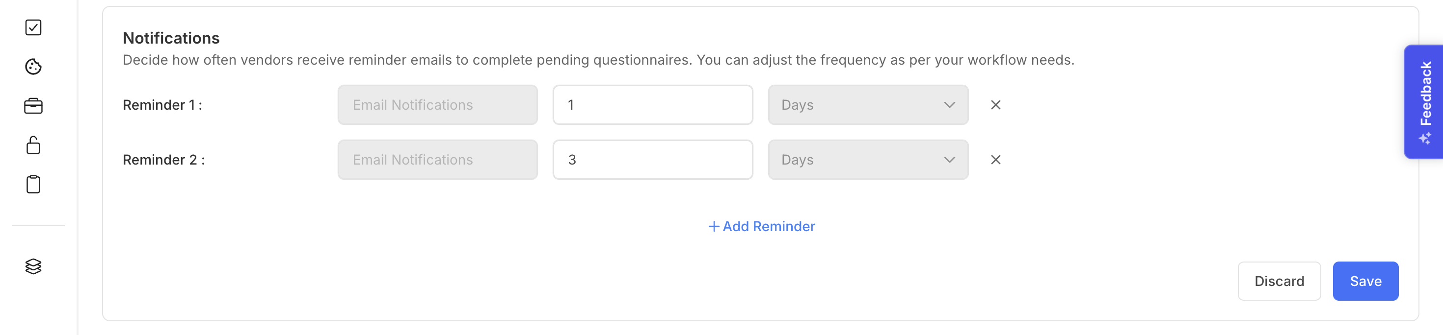 You can specify one or more reminder intervals (in days) to notify vendors before the questionnaire’s due date. These reminders help ensure vendors complete and submit their responses on time.
