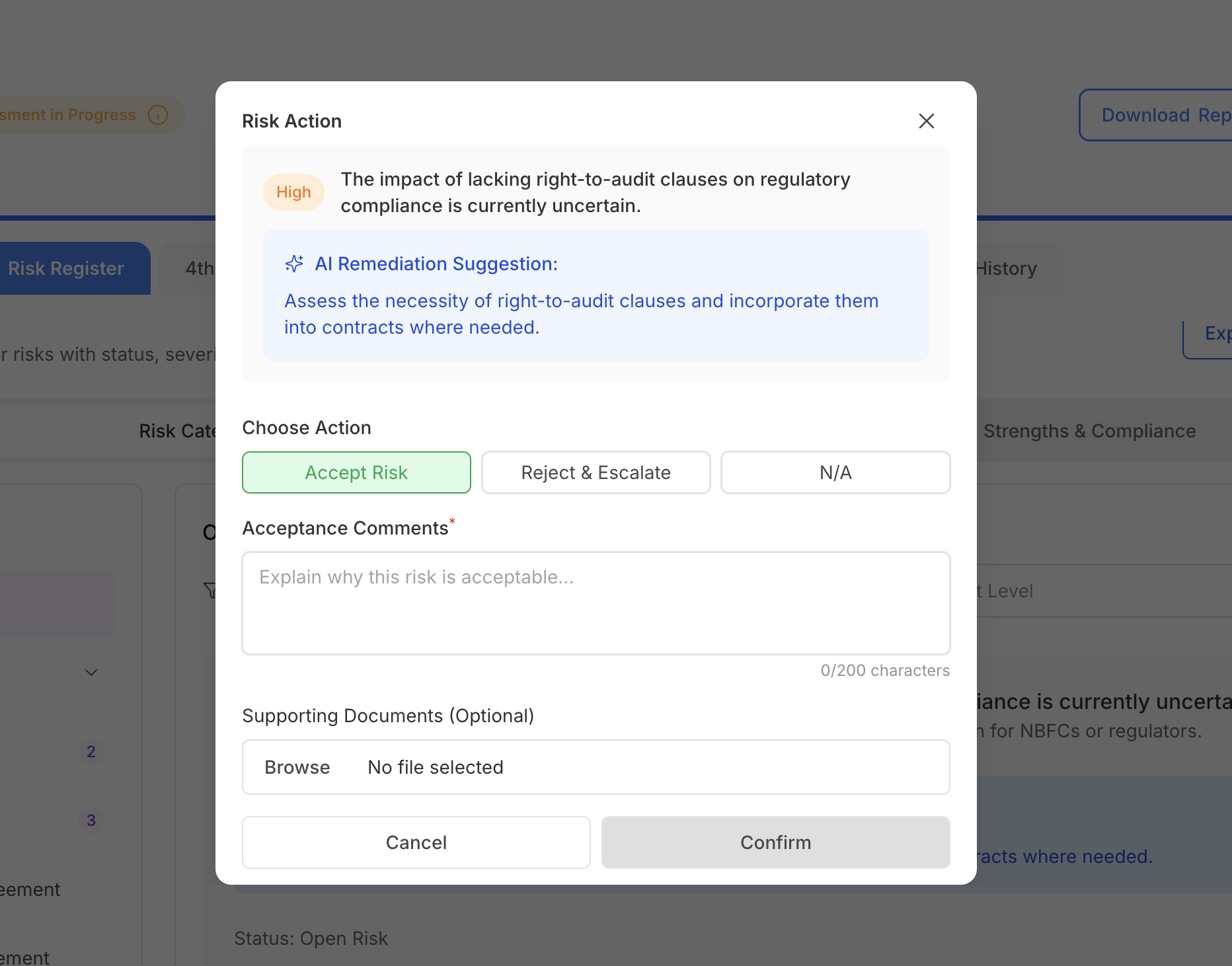 - Reject & Escalate - Reject the risk assessment and escalate it for further review or investigation.