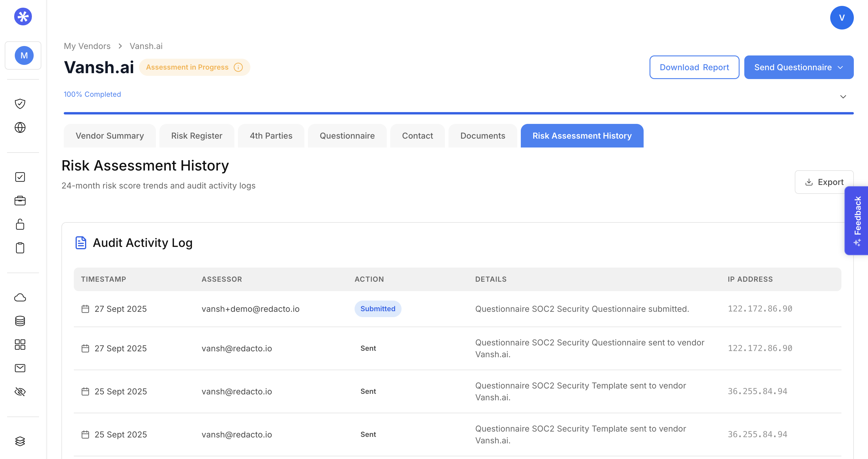 Under the 'Risk Assessment History' , you can track any modifications, additions, or removals of files, as well as updates made to vendor information.