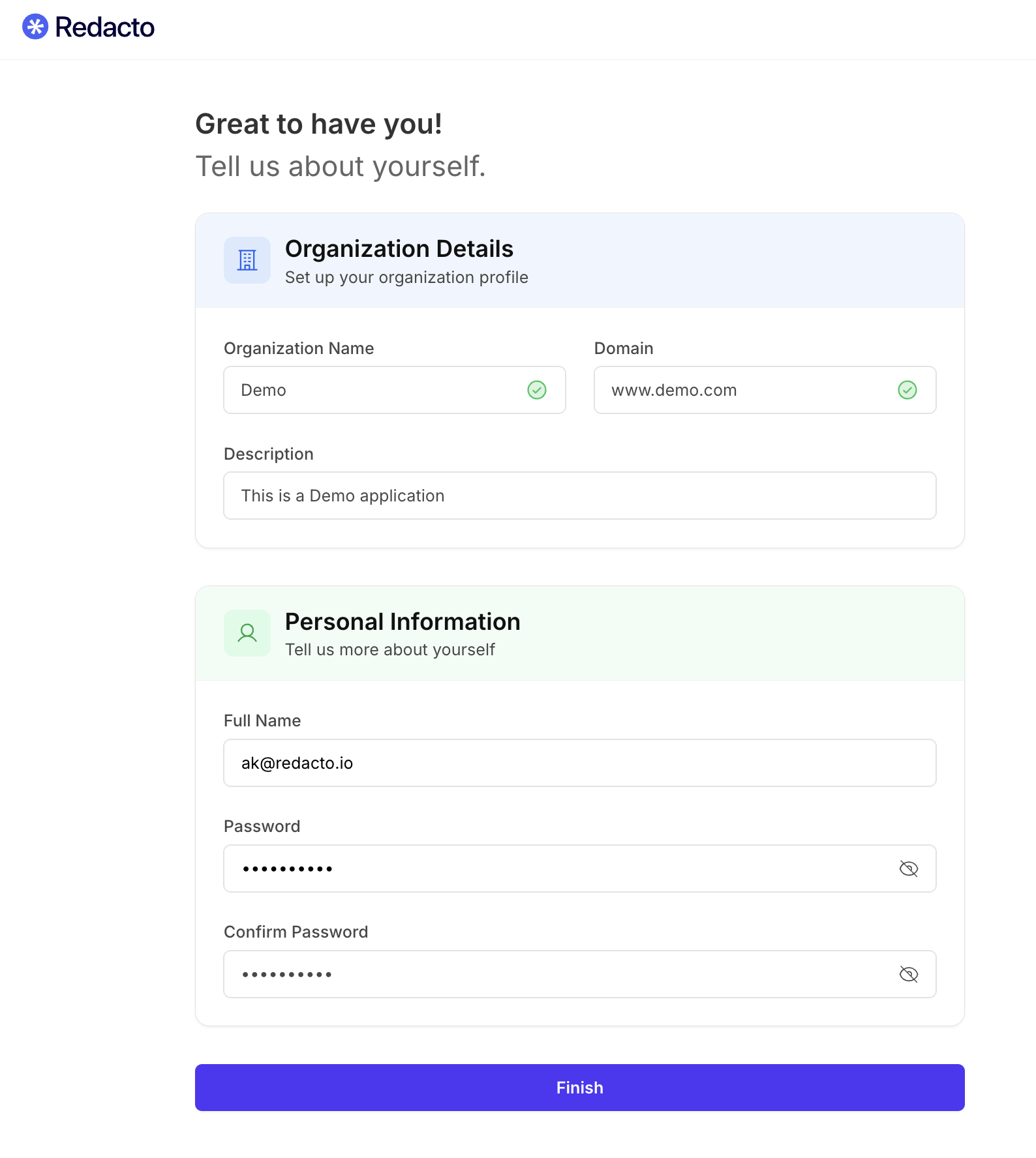SignupSteps Signup using SignupUrl using your email Verify your OTP delivered to your email Fill in your Organization and your personal details Success! Your have signed-up successfully 🎉 Updated 2 months ago LoginTrialTable of Contents Steps