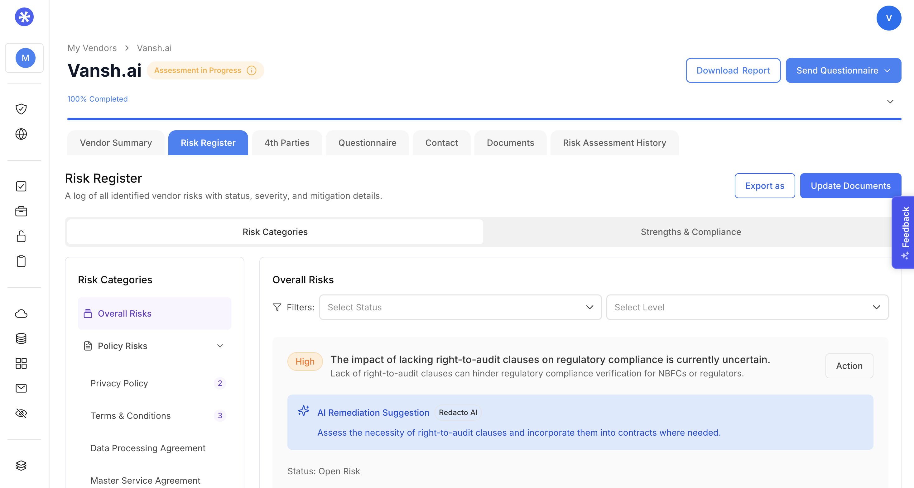 Alongside each identified risk, Redacto AI provides an AI-driven remediation suggestion, outlining recommended steps and controls to mitigate the risks effectively.
